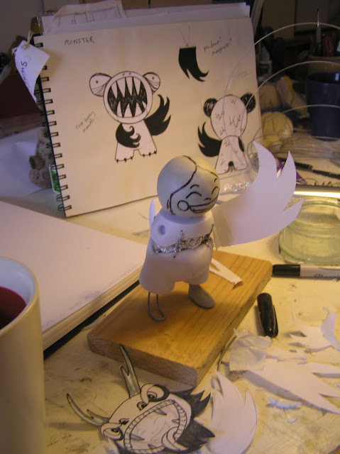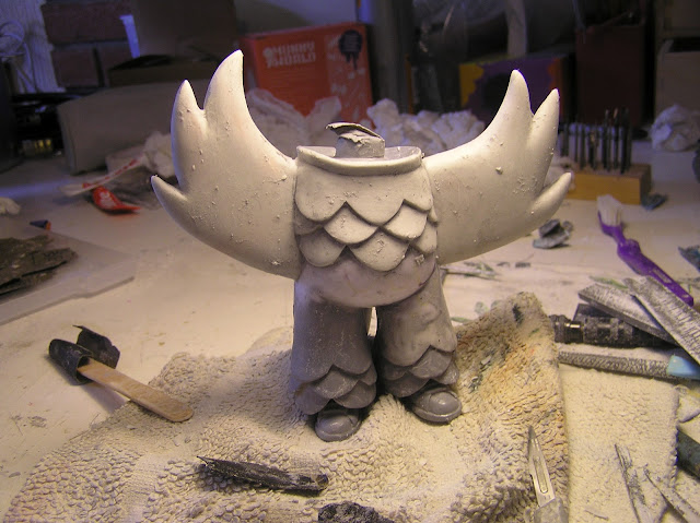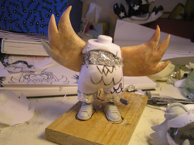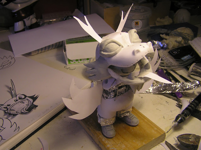 I wanted to stretch the figure out to accommodate a humanesque body, so I extended the legs and added feet. I cut the torso in half and made it longer, keeping the original shoulders and neck so that the girl’s head, which is sculpted onto the original fitting, could still turn. Even the original tail was used as the tip. The Dragon’s mask is lined with felt, so it sits comfortably on Yin’s head.